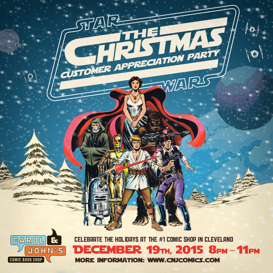 First off, we’re here to remind you about our Christmas Party and art show on Saturday December 19th. The art show will last through the day and end with a party from 8pm to 11pm. The theme this year is Star Wars, and all the art will be winnable through a basket raffle system with all funds going to the Cleveland Food Bank.