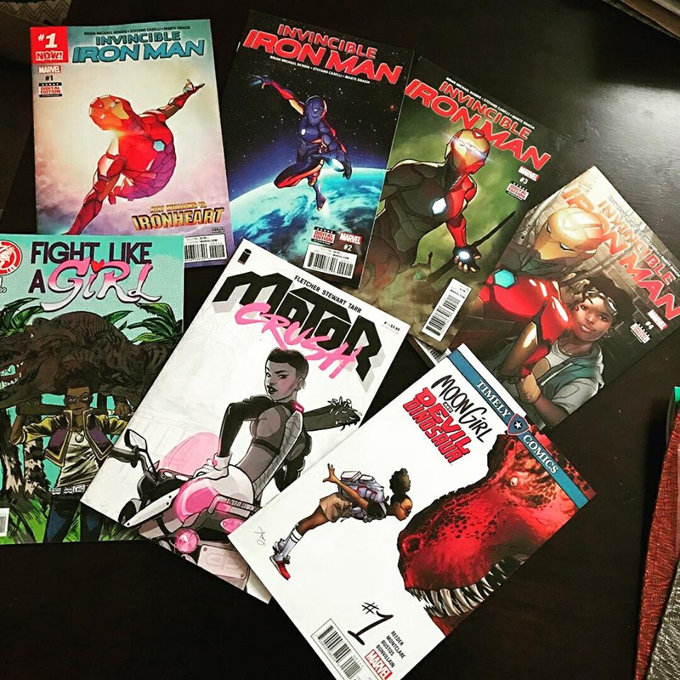 We noticed a recent trend in strong Black Female Characters and thought it would be a good opportunity to present them with copies of Riri Williams Iron Heart, Moon Girl and Devil Dinosaur, Image’s Motor Crush and Action Lab’s Fight Like a Girl for them to review.