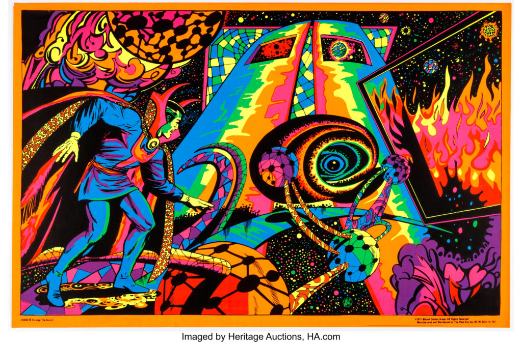 Every year this six-member art conclave creates a twelve-foot-long mural throughout the day. This year we decided to have a black light theme, inspired by the old Marvel blacklight posters from the ’70s! (it is Doctor Strange the Multiverse of Madness movie weekend too!)