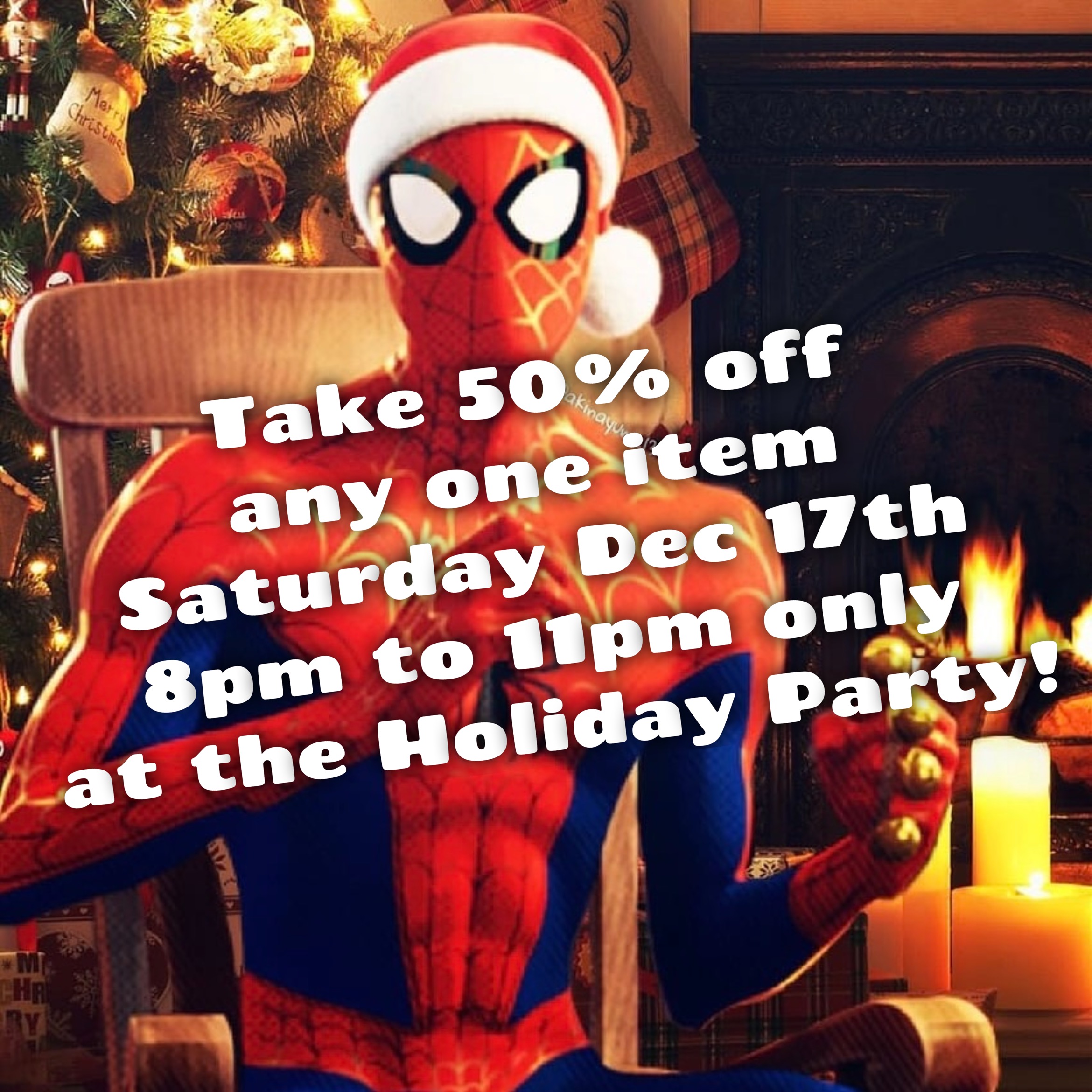 The Art Show will culminate on Saturday, December 17th, when we pull the winners at the end of our Holidays Party that night. YES! The Holiday Party is back, and ALL are invited. We haven’t had the party since 2019, and we’re excited to get back at it again. We’ll close the shop at 7 pm as normal, only to reopen from 8 pm to 11 pm for the party. First up, everyone in attendance will get to use this coupon for 50% off ANY one item.