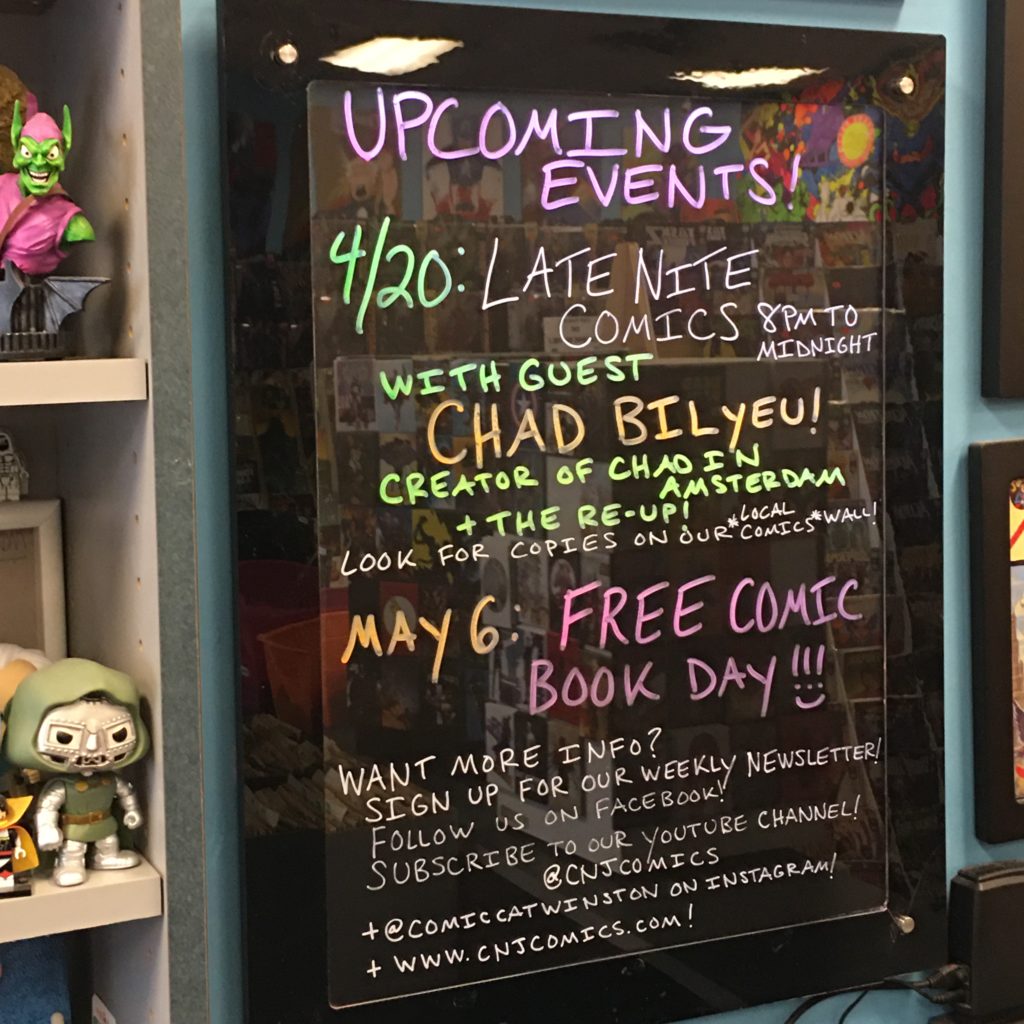 Coming up this month is Late Nite Comics on Thursday, April 20th, from 8 pm to midnight! We’ll have another 40 long boxes of dollar stock out for you to hunt through, 50% off back issues, and a special guest, Chad Bilyeu. He’s the creator of Chad in Amsterdam and The Re-Up, which you can find on our local comics wall. He’ll have a table during Late Nite, selling his comics, so stop by to check that out!