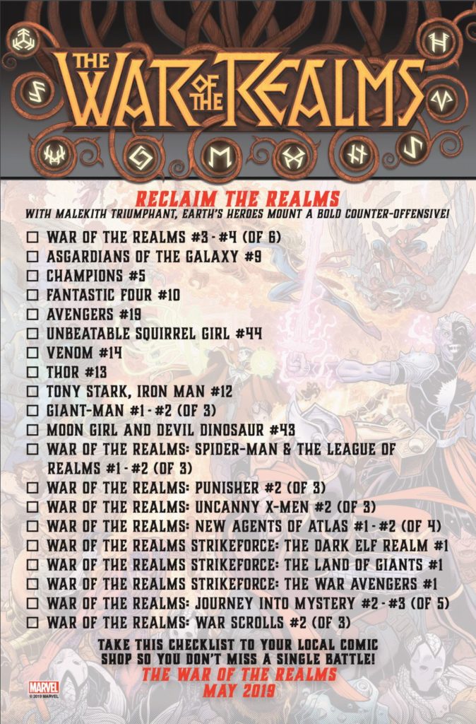Last week was owned by DC and Detective Comics #1000, this week is all Marvel with  the War of the Realms! Here’s the featured new releases coming out this Wednesday, April 3rd, 2019! War of the Realms This will be the first major event for Marvel in some time, and it’s the culmination of Jason Aaron’s efforts over in Thor. The forces of the Ten Realms are headed to Earth for an all our war with the MCU. Other than Aaron’s involvement we’re really excited about the street levels characters joining in, like Punisher, Daredevil and Squirrel Girl. This book has a ridiculous amount of covers, so just pop into the shop early and get the one you like the most.  Here’s a quick recap to get you up to date! War of the Realms is a six issue mini-series that will last into June. There are checklists for the next three months if you want to print them out and turn them in. Don’t get caught up in plot threads you don’t care about! Reading the main title alone...