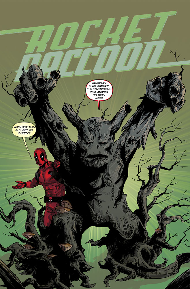 Okay, one more image. Marvel has these really cool Deadpool cover bomb variants this month, and here he is dropping in on Groot’s first appearance in Rocket Raccoon #4.