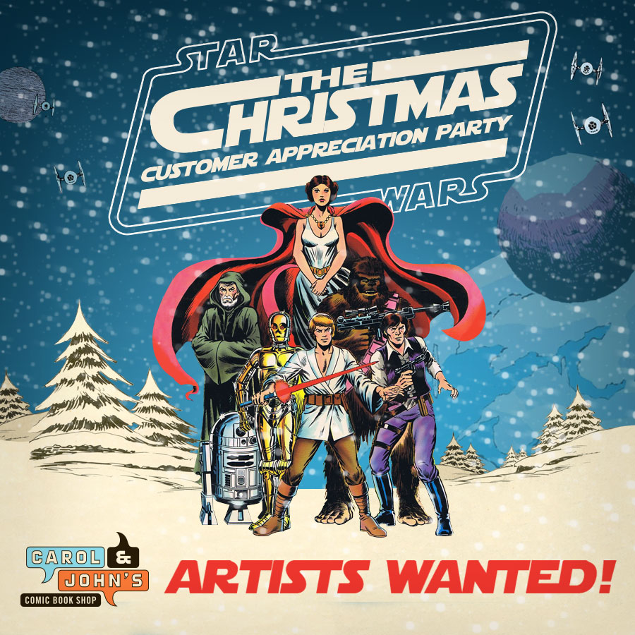 Last year, with assistance from Pop The Comic Culture Club, we raised enough money to help the Food Bank create over 11,000 meals for those in need during the holidays. We also collected over a thousand food items. You can be a part of this! Artists, stop by the shop and pick up a blank Star Wars cover that looks like this: