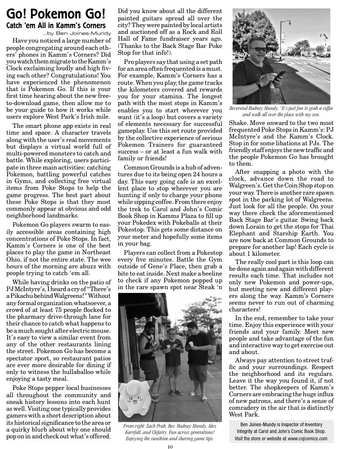And Ben was assigned a full page to guide you through the wild and wonderful experience of playing Pokemon Go through-out Kamm’s Corners and the West Park Neighborhood. Check out the great pics of his Dad catching ‘em all.