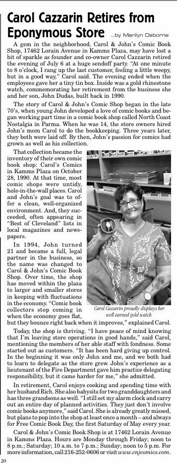 Carol was featured for her fantastic accomplishments of keeping all of our butts in line and running a local comic shop through some bubbles in the 90s. She successfully (and fully) retired last month.