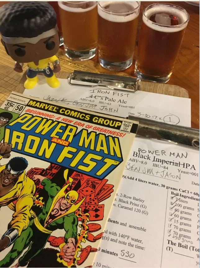 Label designs are coming but for now we can tell you that we’ve created a Power Man Black IPA with Summit, Centennial and Amarillo Hops (one punch will knock you out, be careful) and and Iron Fist Pale Ale made with Columbus, Chinook, Centennial and Cascade Hops (will have the same effect, but will dance around you a little before striking.)