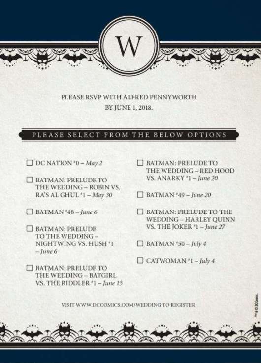 Here’s a checklist leading up to the Wedding issue coming out on July 4th. We suggest you print it out and turn it in at the shop, even if you only want the 50th wedding issue. I’m going to suggest adding the Catwoman #1 by Joelle Jones as well. She’s cool, her artwork is killing it, and they’re letting her write this book as well. The one shots leading up to the wedding are really just for fans who want something extra.