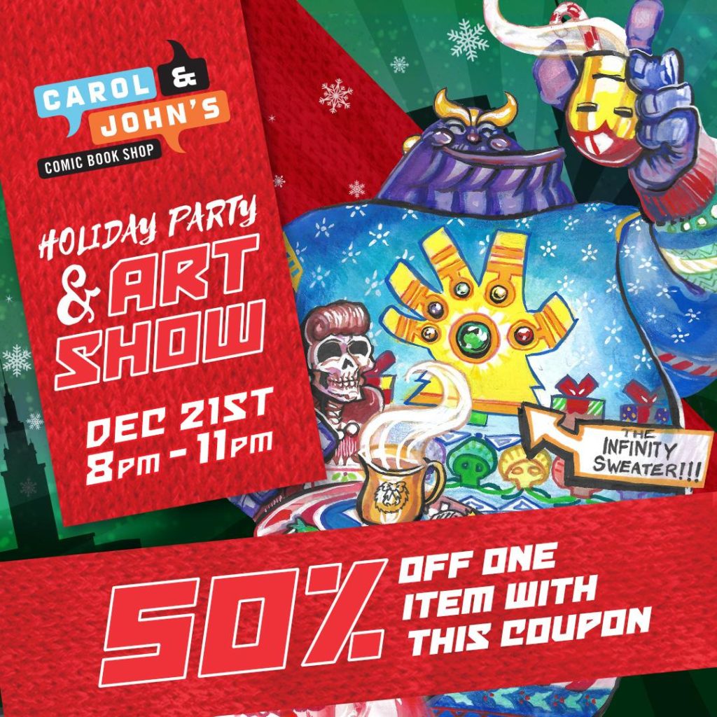 On Saturday, December 21st from 10 am to 7 pm we’ll be hosting an art show featuring local artists who created custom covers to benefit the Cleveland Food Bank. These covers can be won in a basket raffle system where one food item or one dollar gets you a ticket. You pick which cover your ticket goes to so you can win a one you really like. This year’s art show theme is a comic book character / Christmas movie mashup, which we’ve been having a lot of fun with.