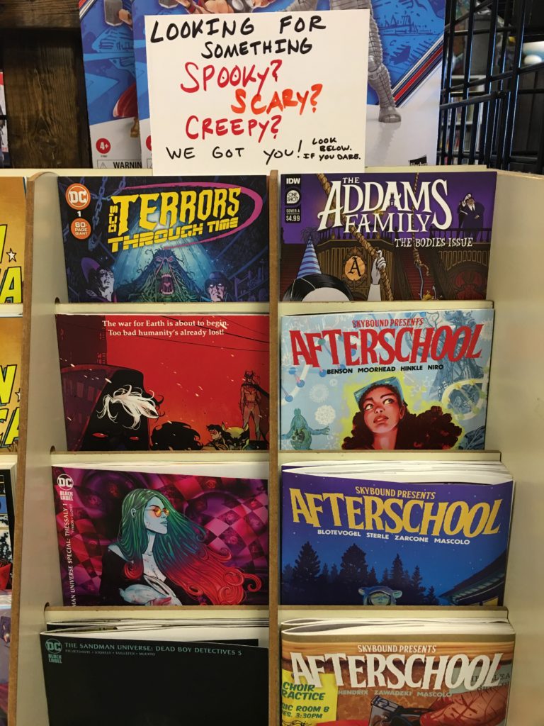 Looking to fill the rest of October with creeps and chills? (I know I am.) Then check out our staff recs for spooky and scary books! There are a few rows on our rec wall, and we’ll fill the table with more when there’s room. Ask us or our favorites! Some of mine are Creepshow, The Nasty, Harrower (the trade is out this week!), and Night of the Ghoul.