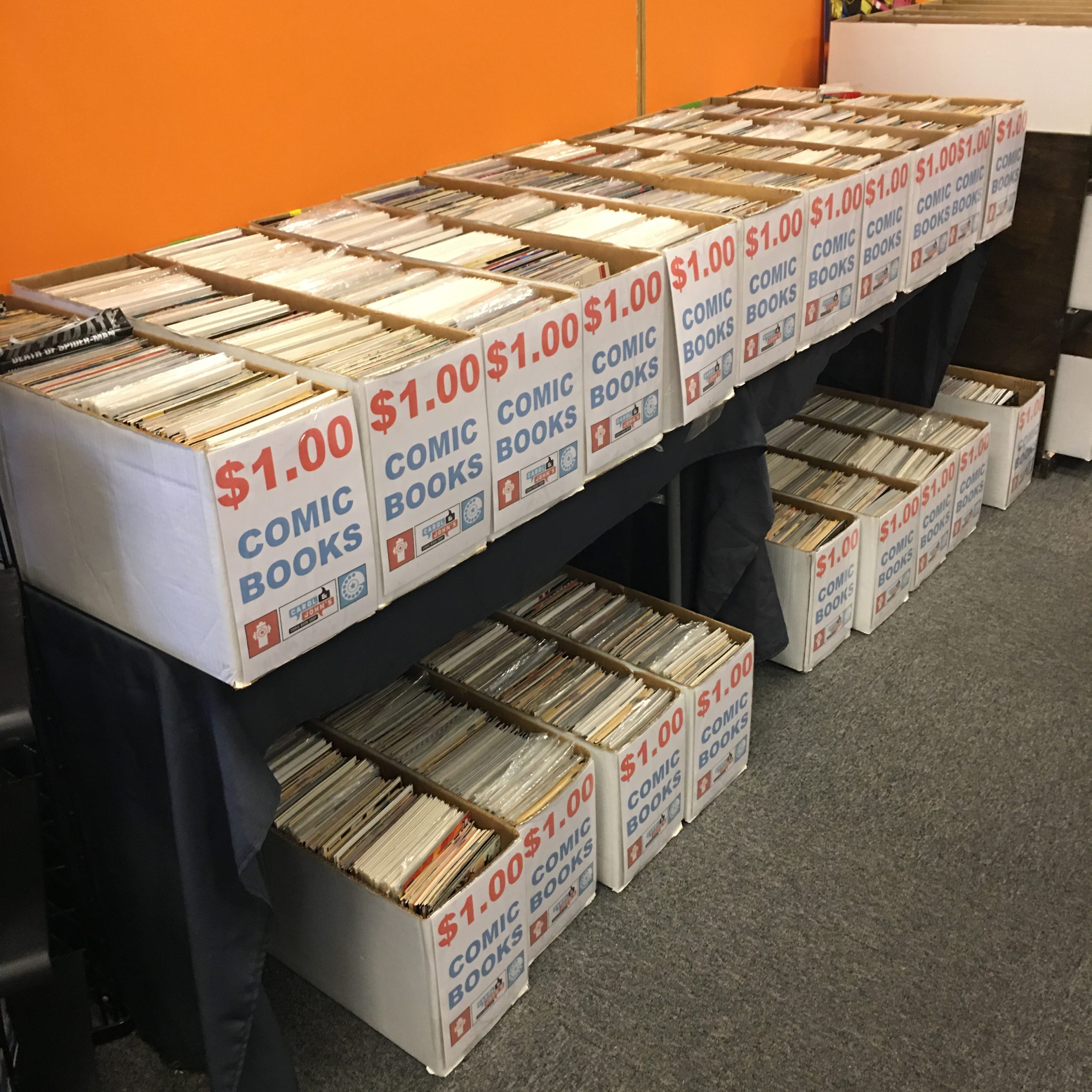 We have a temporary setup until the new back issue bins are built, but dollar books are out in their new home!