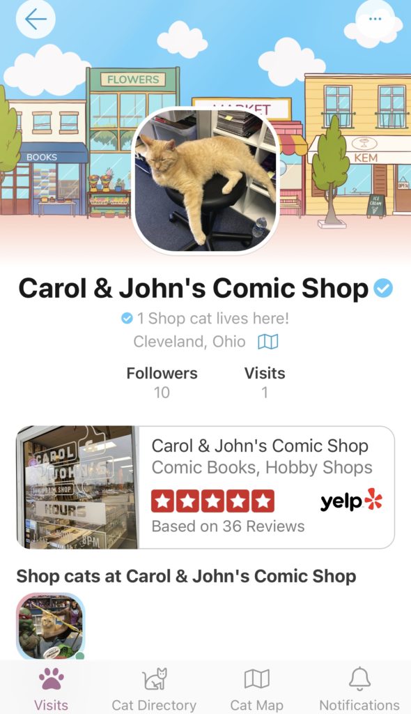 There’s also a map to help you find other shop cats in the area. My favorite thing is when I open the app, it tells me when there’s a shop cat nearby! Cats!