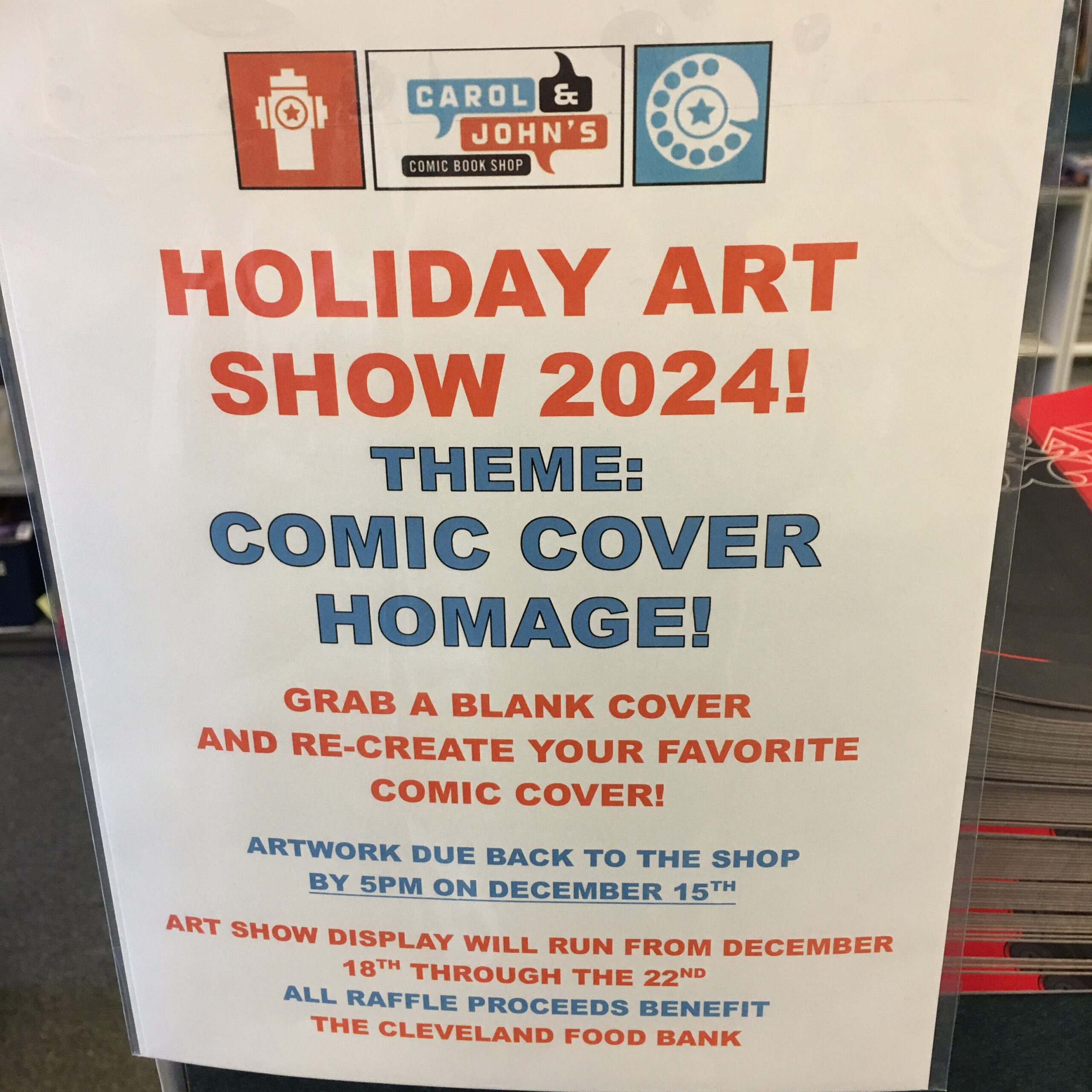Make sure to pick up a blank cover for our Annual Holiday Art Show! This year’s theme is an Homage to a Classic Comic Book Cover! Submissions are due back by Sunday December 15th by 5pm. We’ll have them on display in the foyer before our Holiday Party, and all proceeds from the Art Show raffle will benefit the Cleveland Food Bank.