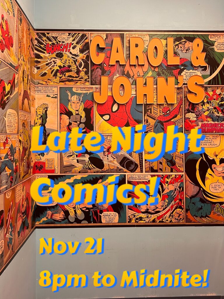 This Thursday is Late Nite Comics! 50% off all back issues! Tons of dollar stock! And if you get 100 or more dollar books, they’re 50 cents each! John is also allowing you to film in the shop for one night only, so feel free to film your dollar diving for your social media channels! Open til midnight!