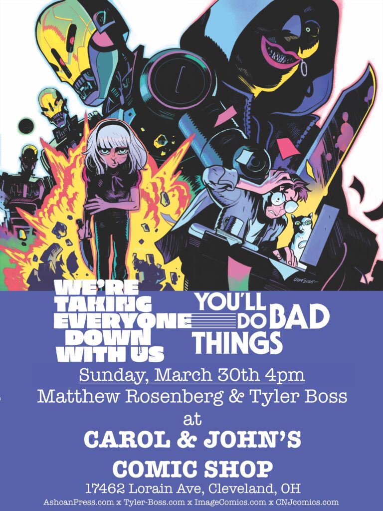 This Sunday, the 30th! From 4pm to 6pm! Matthew Rosenberg and Tyler Boss will be here for a free signing! We’ll have copies of each of their new #1s, We’re Taking Everyone Down with Us and You’ll Do Bad Things, to give out so you can get them signed. Check out the display on the counter and the Rosenberg and Boss Rec Wall row for more great stories from them!