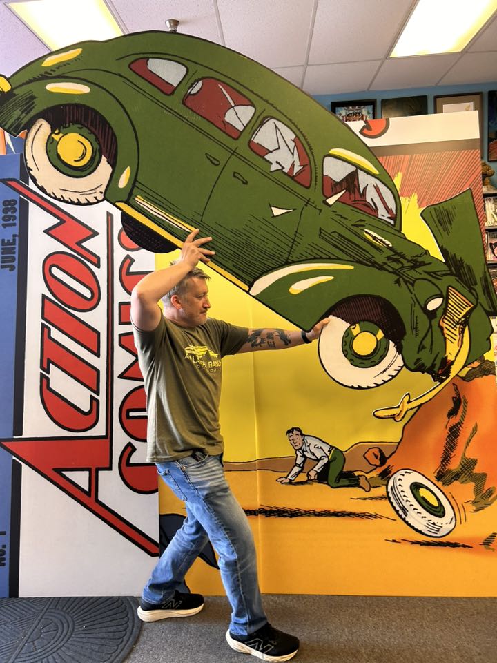 “Here’s something I’ve been slowly working on for the Superman movie this month. It’s coming together way better than I expected, too. There’s a lot going on around town so we wanted to do something that was decisively comic book in nature, like building an 11-foot-tall interactive Action Comics #1 photo backdrop! Some assembly still required but it will be ready in the foyer next to the shop from July 9th to the 16th, so movie release weekend. It barely fits in there! (I also made a smaller car for kids to be able to hold.) We’ve been hoarding Superman comics from FCBD and Superman Day this year, as well as the new reprint of Krypto’s first appearance, so everyone stopping in those days will be able to grab some free comics as well! Honestly, all I ask for my efforts is that anyone posting their pictures on socials gives us a little shout out if they feel so inclined. Truth, Justice, and the American Way!”