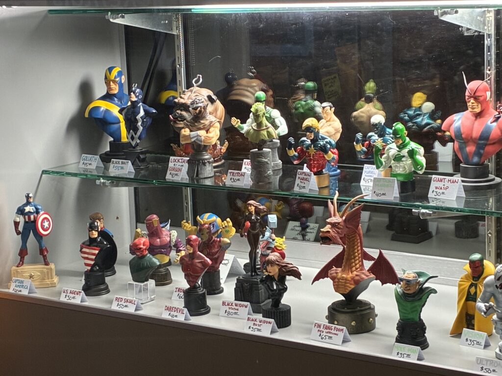First, you probably saw John’s Facebook post, but we are stocked with a collection of Bowen statues! For the week, our usual back issue wall will be showcasing the busts and mini statues, and we’ve updated the case to feature them all. The Gallery statues that were in the case are now in their boxes above the graphic novel wall.