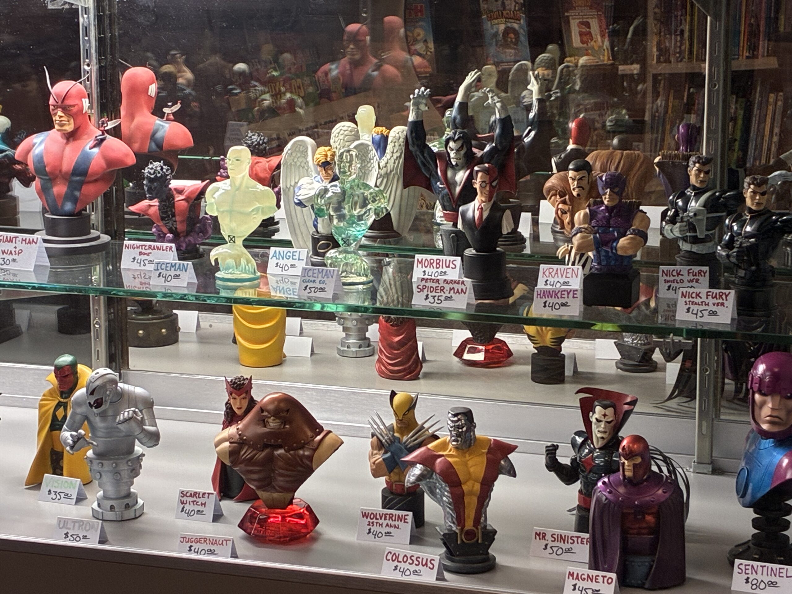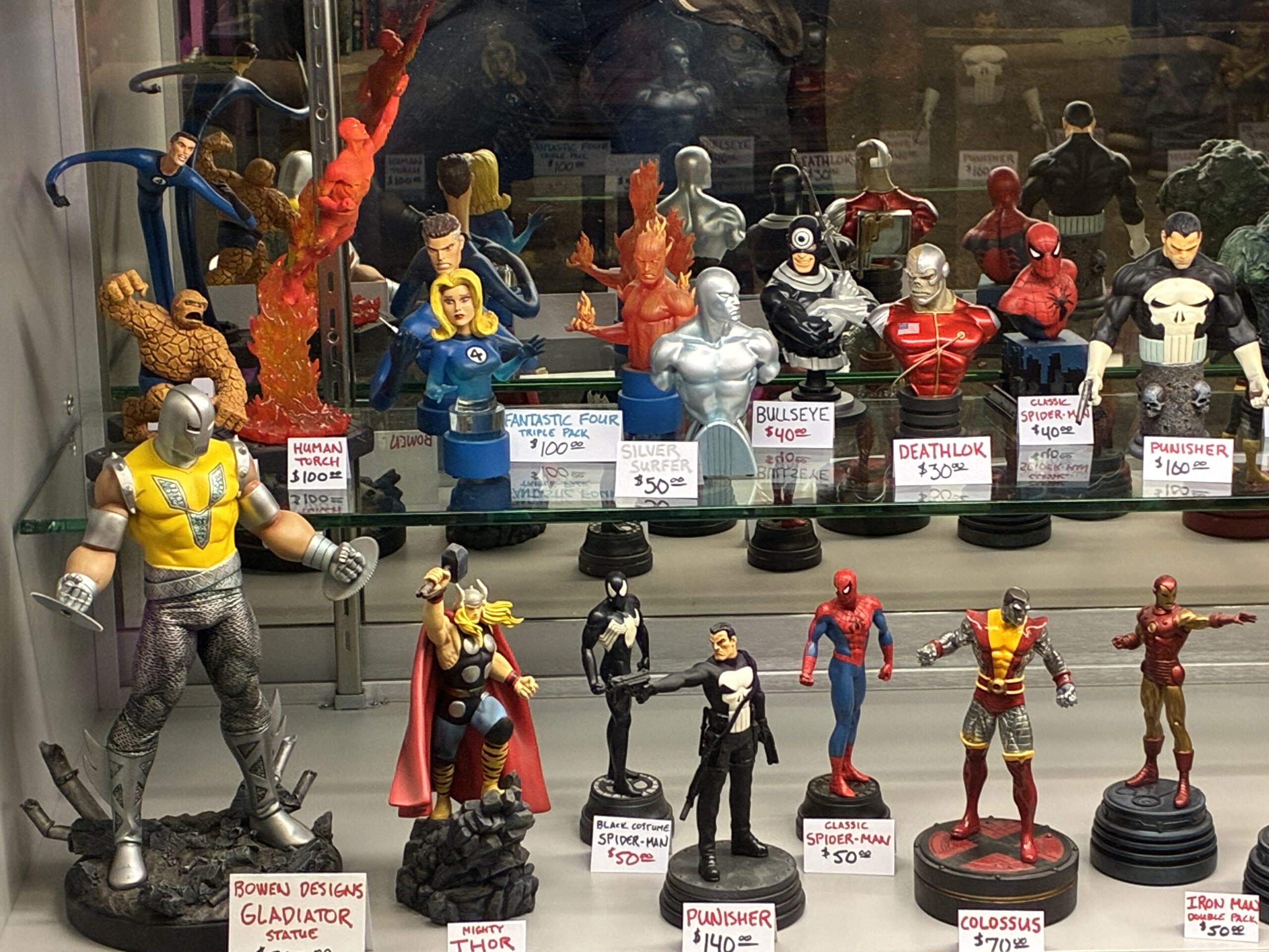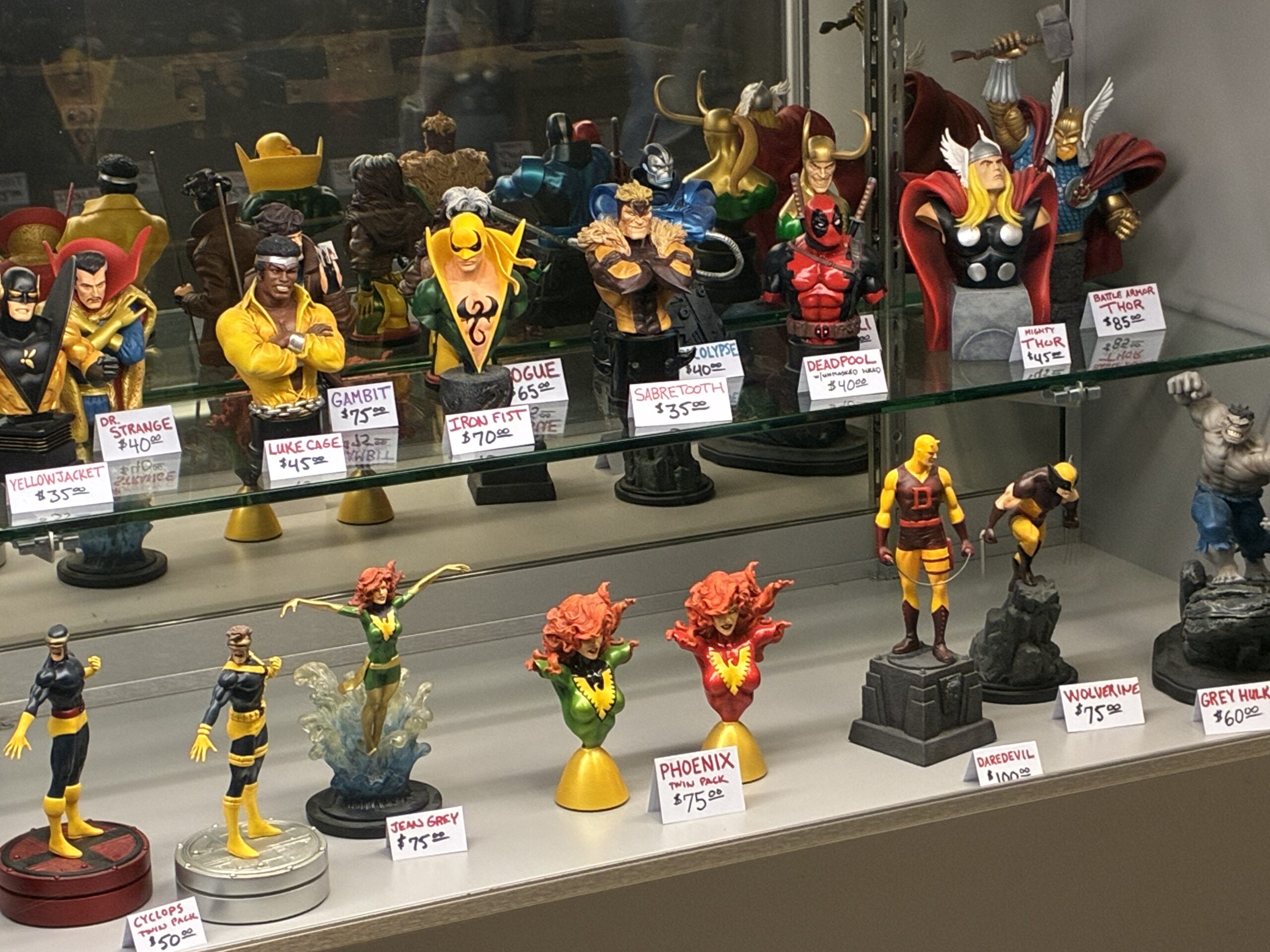 First, you probably saw John’s Facebook post, but we are stocked with a collection of Bowen statues! For the week, our usual back issue wall will be showcasing the busts and mini statues, and we’ve updated the case to feature them all. The Gallery statues that were in the case are now in their boxes above the graphic novel wall.