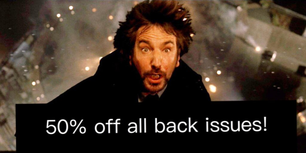 All back issues, including the wall, are 50% off Wednesday the 17th through Wednesday the 24th! That’s one full week of back issue bargains!