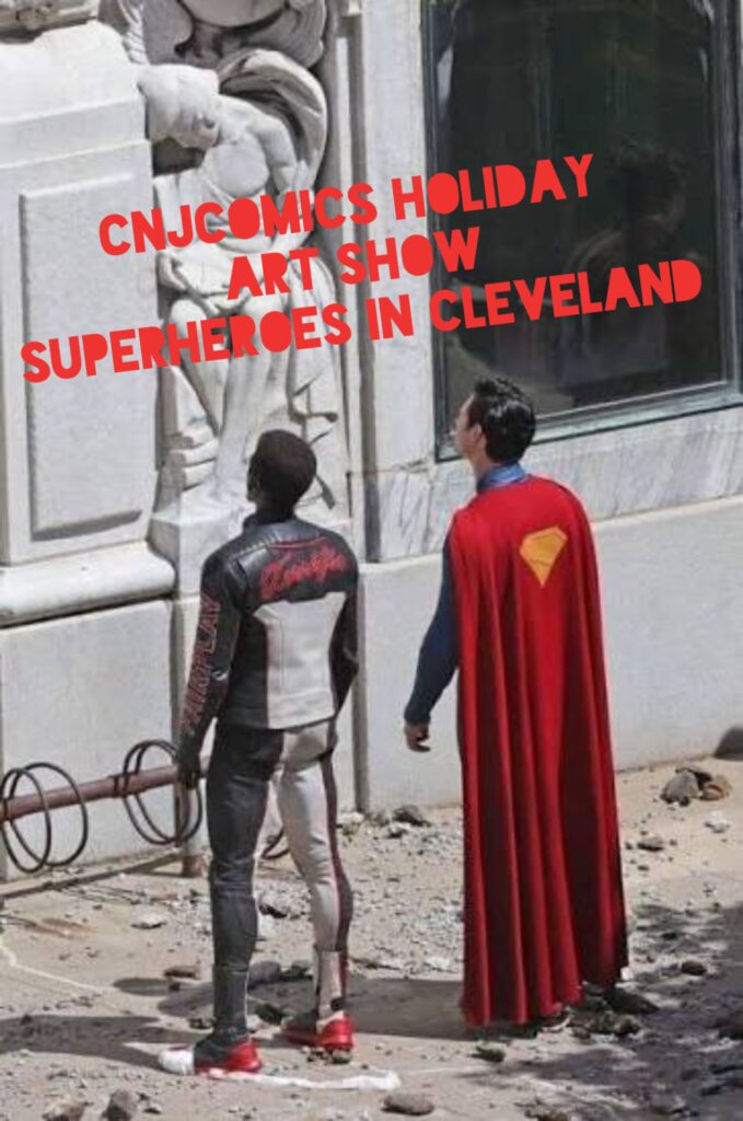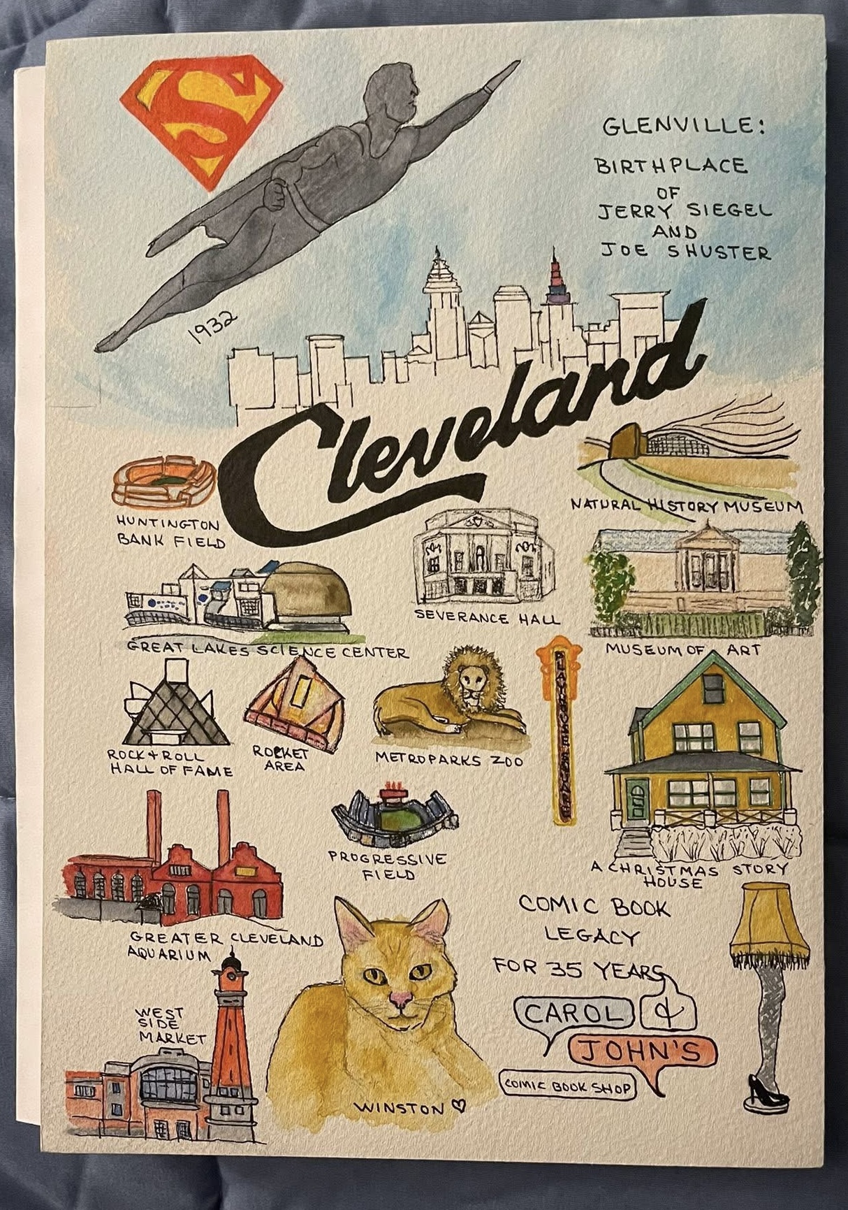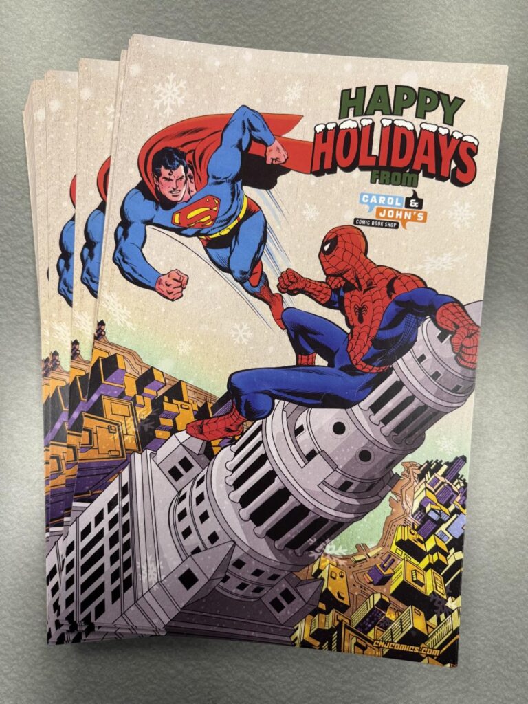We also have a new holiday poster to give away with a purchase! Jameson reimagined the first Marvel/DC crossover in the spirit of our Art Show theme, Superheroes in Cleveland, putting Superman and Spider-Man atop the Terminal Tower. Supplies are limited, and we ask only one per customer, so we can have enough to make it to Christmas.