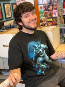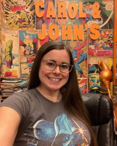 “Hey everybody my name is Missty! You can catch me at the shop most weekends. My collection is compiled of mostly new-age comics. I enjoy reading anything that has Rogue or Batman in it. That’s right, I’m on both sides of the Big Two! I’m happy to talk about both Marvel and DC comics. One of my favorite parts of collecting is taking a detailed inventory of and organizing my comics. With that said, it just made sense to work at a comic shop. I love that I get to work with such an amazing crew in the heart of my hometown.”